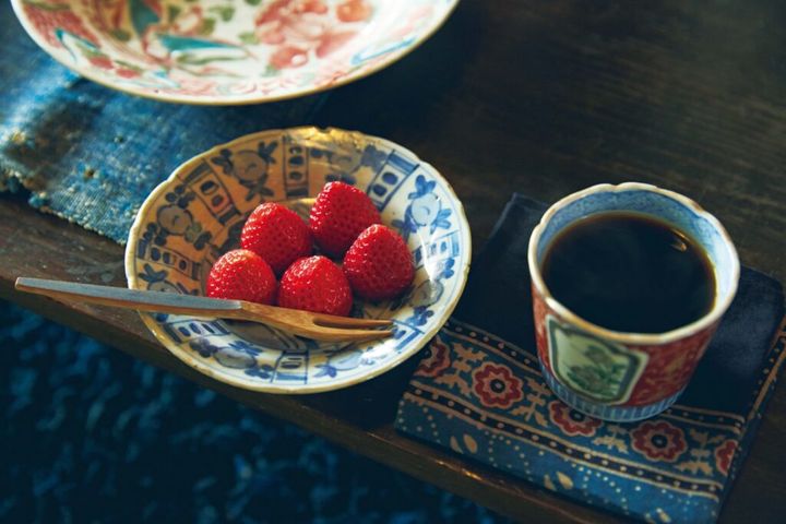 ヒロキさんとケルシーさんのデザートの定番は、小粒で果肉がぎゅっと詰まったオーガニックのいちご。染付の青といちごの赤のコントラストが目を楽しませる。蕎麦猪口にはデカフェコーヒーを。「コーヒーカップにちょうどいいサイズなので使い続けています」