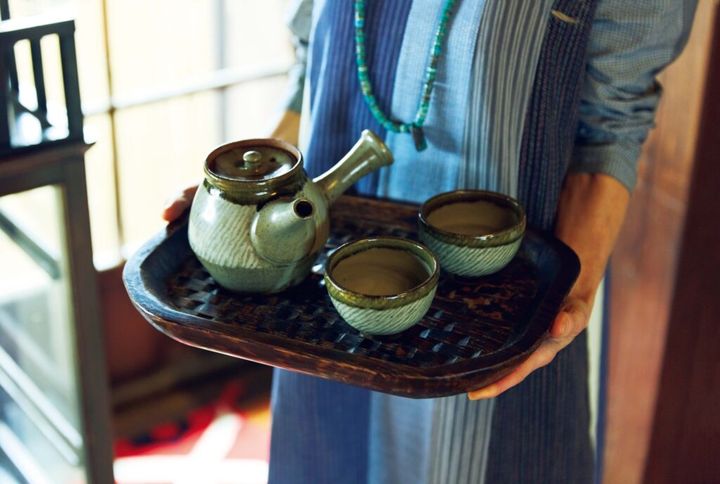益子の陶芸家・島岡達三の急須と茶碗を用いて、お茶の時間を楽しむ。ドクダミ茶、デカフェコーヒー、ジャスミンティー、白湯などを。