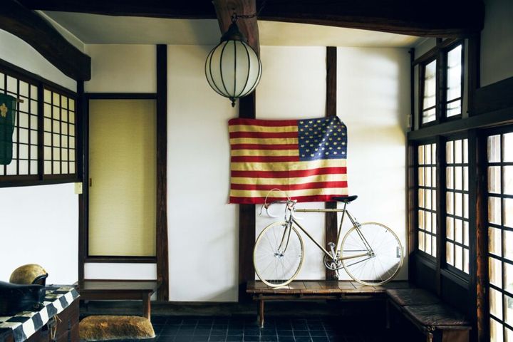 玄関を開けると土間が。ヒロキさんが愛用するイタリアの歴史ある自転車ブランド〈CINELLI〉のバイクを飾った。