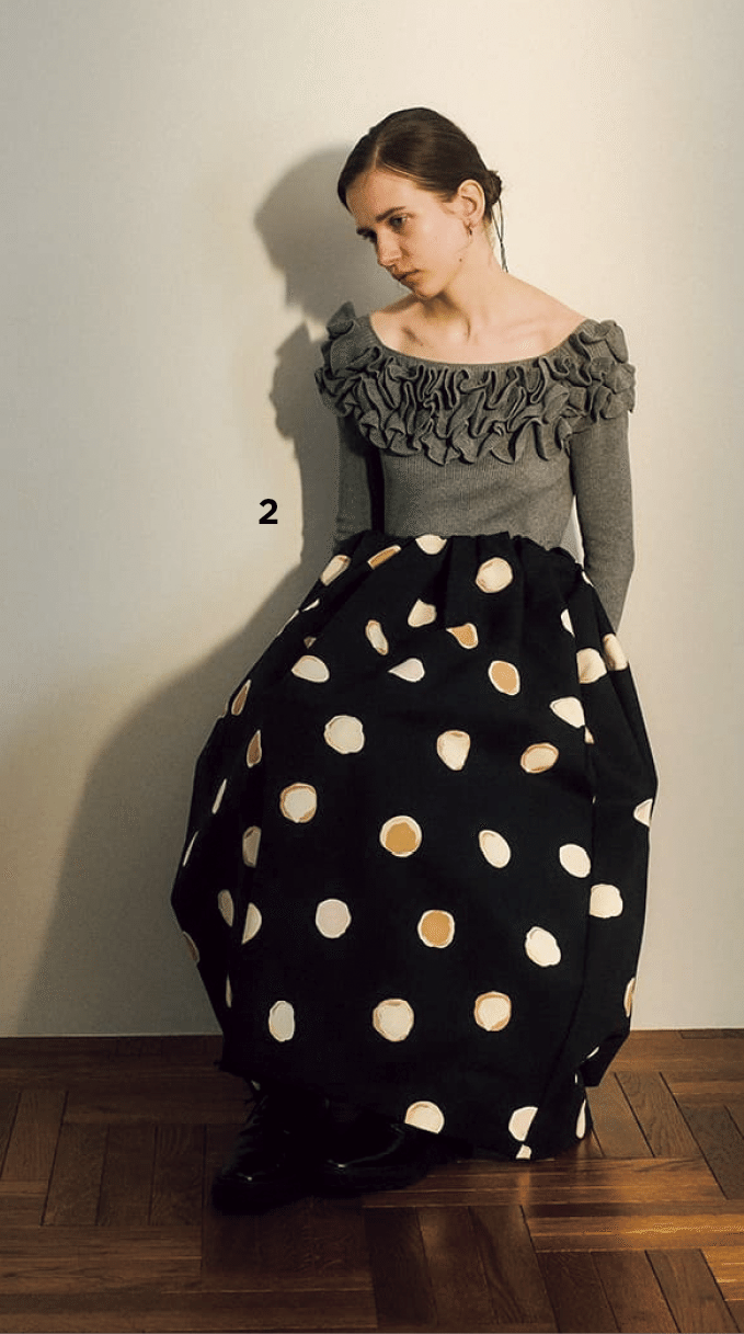 編集O(以下O) ヨンアさんのブランド、コエルにも可愛いドットのスカート②ありましたよね。ちょっとガーリーなフリルトップスと合わせてて素敵でした。