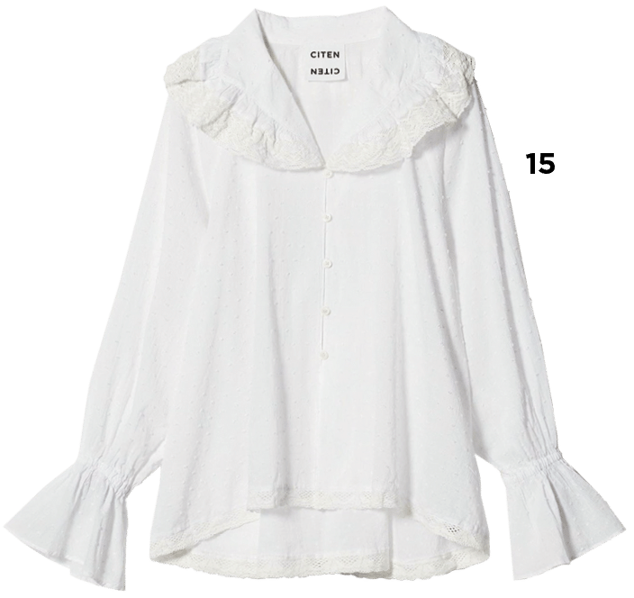 K 最近いろんなブランドでよく見るよね、フリルが付いた大きい襟のブラウス。