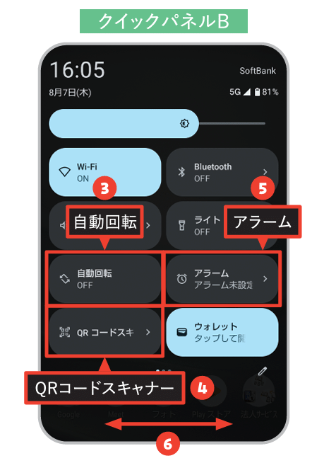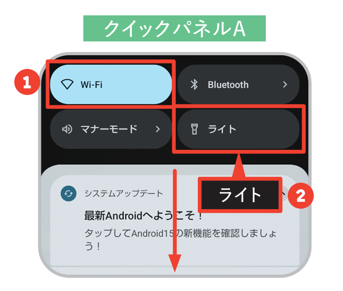 ホーム画面を上から下へスワイプ。その画面(クイックパネルA)からさらに下へスワイプするとクイックパネルBが表示される。