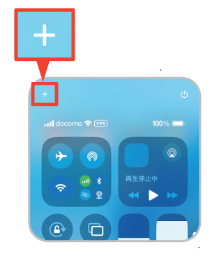 コントロールセンターの左上にある「+」アイコンをタップします。画面下に出る「+コントロールを追加」をタップすると、コントロールセンターに追加できる機能の一覧が表示されるので、追加したいアイコンをタップします。
