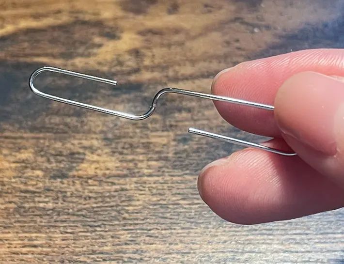 ゼムクリップの内側を手で持ち上げて、反対に倒します。このようにS字になれば準備は完了。