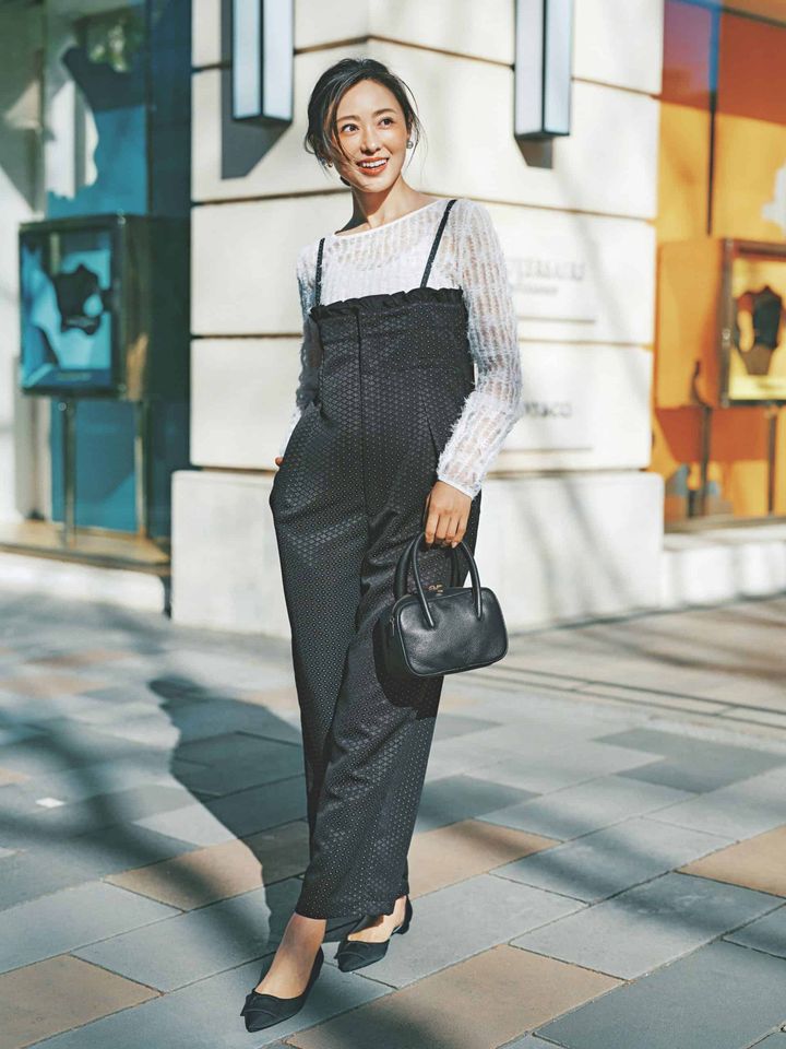 黒ベースのコーデに、シアートップスを投入。縦のラインから肌をほんのりチラ見せすることで、旬らしい抜け感のある着こなしに。サロペットも甘さたっぷりなドット&フリルのデザインが入っており、重見え回避◎。