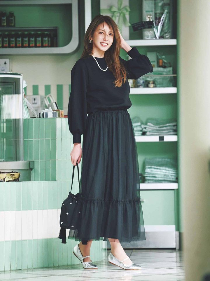 光沢のあるシルバーパンプスが引き立て役に適任。ヒールのないフラットなソールなので、よりマイルドな着こなしが実現できます。ふわりと靡くチュールスカートと合わせると、軽やかな足取りに。