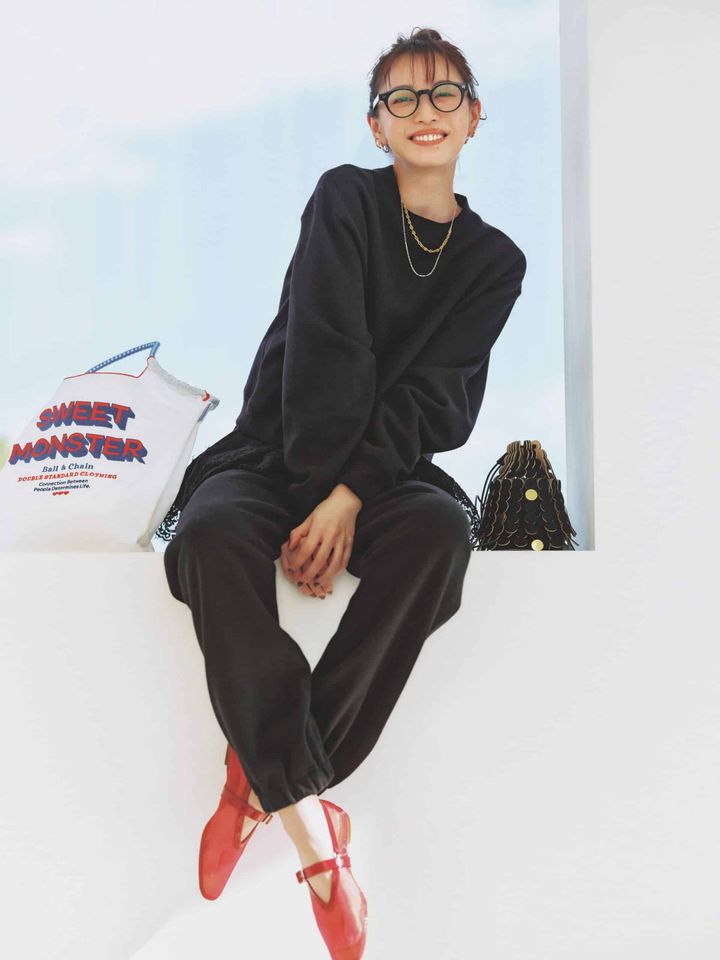 シューズ¥42,900(ヒューン/クルーズ ショールーム)スウェット¥25,300パンツ¥30,800(ともにハイク/ボウルズ)レースキャミソール¥18,700(カデュネ)黒バッグ¥44,000(メアリ オル ターナ/AL Design Inc.)エコバッグ¥6,050(Ball & Chain×ダブルスタンダードクロージング/フィルム)ピアス¥3,850(ヘンカ/ロードス)メガネ¥44,000(プロポ/プロポデザイン)ネックレス¥49,500(リューク)