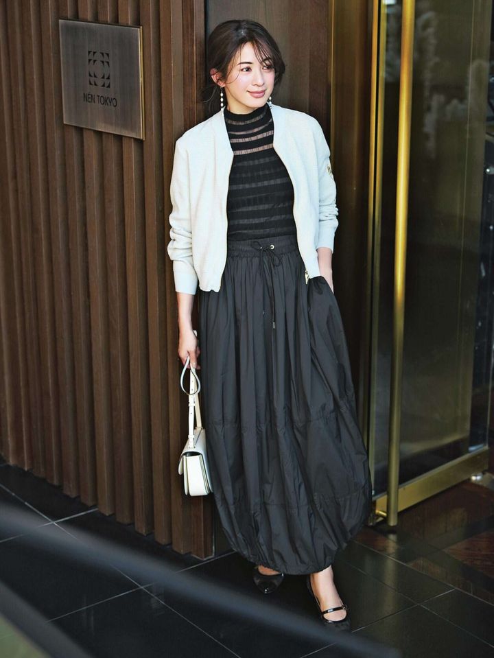 ブルゾン¥61,600スカート¥49,500(ともにタトラス/タトラス カスタマーセンター)ニット¥25,000(シーニュ)バッグ¥187,000(ボナベンチュラ)パンプス¥36,300(ファビオ ルスコーニ/伊勢丹新宿本店 本館2階 婦人靴)ピアス¥33,000(リューク)