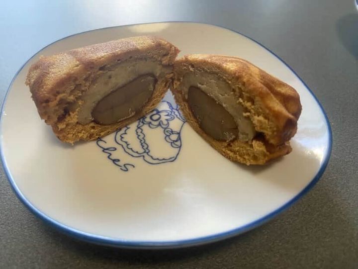 栗どらは、ふわふわ食感で、大粒の国産栗の渋皮煮がまるごと1粒入っていました。噛めば噛むほど口の中で美味しさが広がりました。