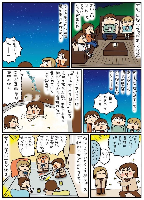 リゾートホテルの夜を彩る満天の星空! 真珠成分が入ったキラキラのお風呂にも大喜び/松本ぷりっつの夫婦漫才旅 ときどき3姉妹 ゆるっと開運編