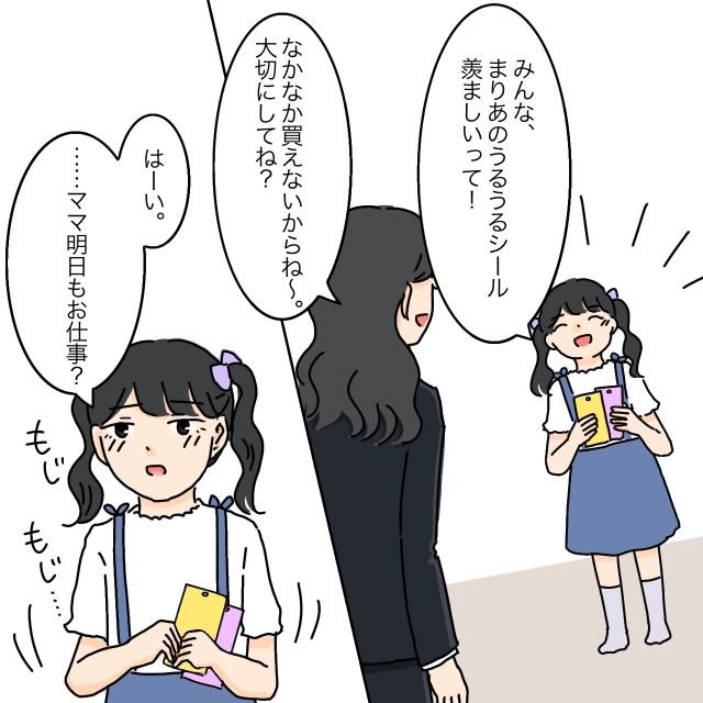 「みんな、まりあのうるうるシール羨ましいって!」そう話すまりあちゃんに、お母さんも「なかなか買えないからね~。大切にしてね?」と満足気。「はーい」と答えたまりあちゃんは、少し言いづらそうに「・・ママ、明日もお仕事?」と聞きました。