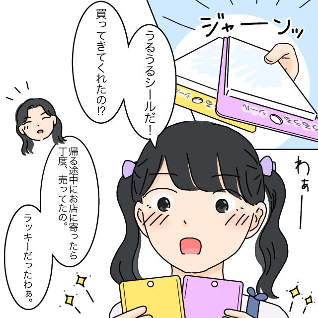 お母さんが取り出したのは、入手困難なうるうるシールでした。「うるうるシールだ!買ってきてくれたの!?」と目を輝かせるまりあちゃんを見て、「帰る途中にお店に寄ったらちょうど売ってたの。ラッキーだったわぁ」と嬉しそうに話すお母さん。