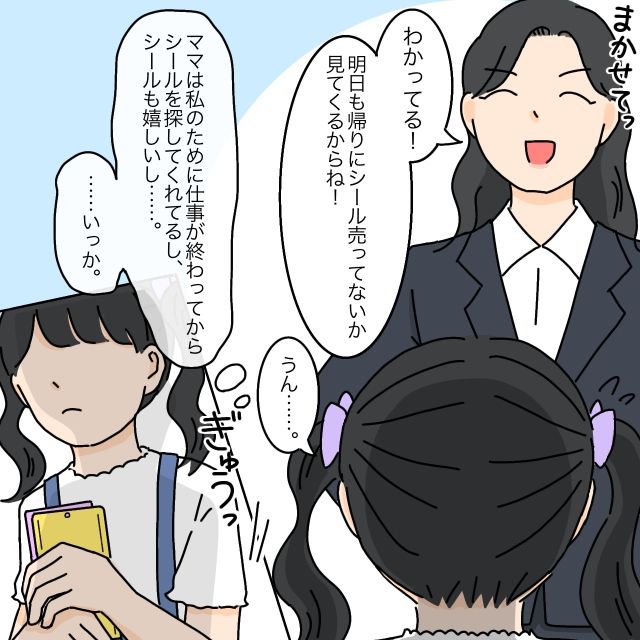 まりあちゃんがまたシールを探してきてほしいのだろうと思ったお母さんは「まかせてっ!わかってる!明日も帰りにシール売ってないか見てくるからね!」と張り切って言いましたが、まりあちゃんは「うん・・」と答えながらもどこか元気がありません。実はまりあちゃんは「ママは私のために仕事が終わってからシールを探してくれてるし、シールも嬉しいし・・。・・いっか」と本当はお母さんにもっと早く帰って来てほしいと言えずにいました。まりあちゃんを喜ばせるために仕事帰りにシールを探しに行っているお母さんは、帰宅が遅くなることでまりあちゃんが寂しがっているなど思ってもいませんでした。