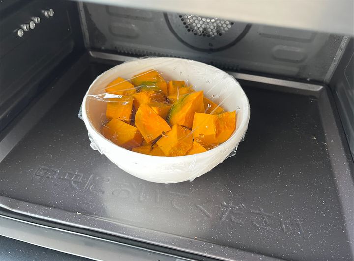 1. かぼちゃの皮を取り除き、2cmほどのサイコロ状に切る。大きめの耐熱ボウルに入れてラップをし、600Wの電子レンジで4分加熱する。