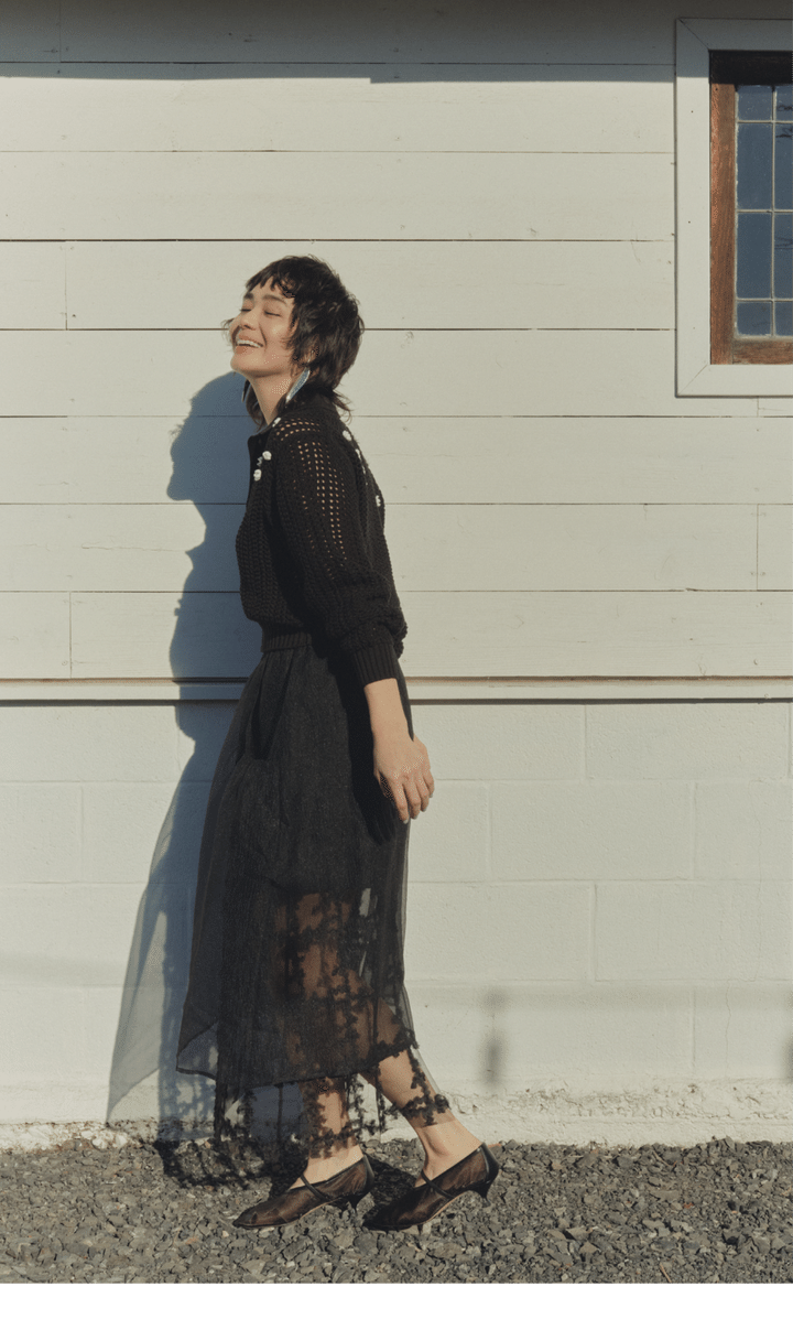 シアースカート¥46,200(バウム・ウンド・ヘルガーデン/アルアバイル)、ニット¥57,200(ジェーン スミス/アダム エ ロペ)、ピアス¥199,100(ソフィー ブハイ/エスケーパーズ アナザーワールド)、シューズ¥64,900(ネブローニ)