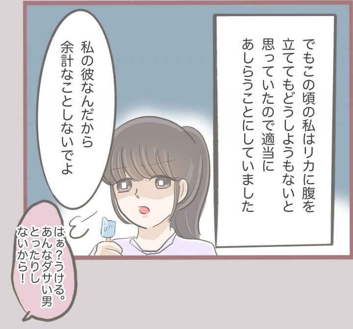 ゆいには一つ年下のフランス人形のように美形の妹リカがいて…。中学生になると、ゆいが想いを寄せる男性にことごとく接近するリカ。ゆいの初めての彼氏にもベタベタしつつ、「男の趣味が悪い」とゆいをあざ笑った。