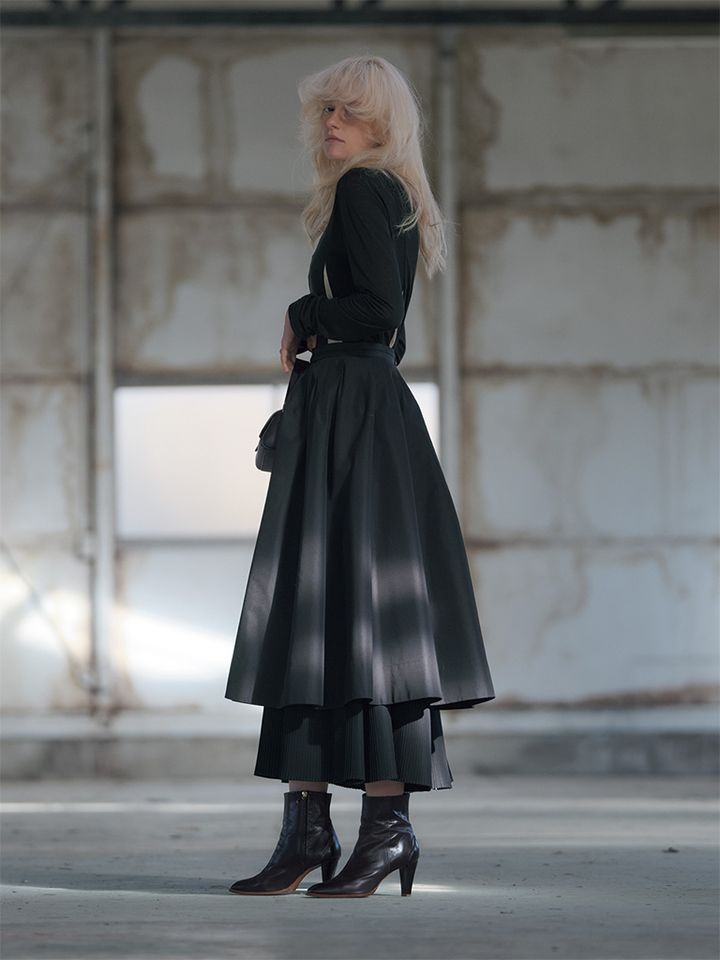 【POINT】無機質なワントーンが豊かに変わる、重ねた生地の立体ドレープ。トップスはフィット感のある長そでTにとどめて、ティアードのシルエットを存分に生かして。