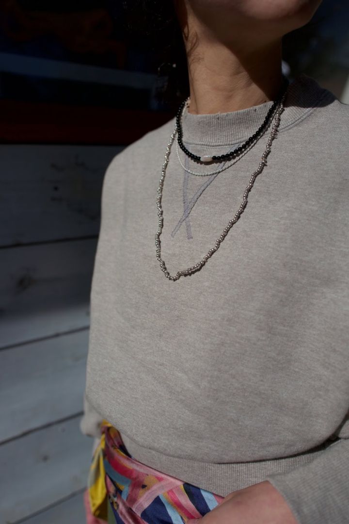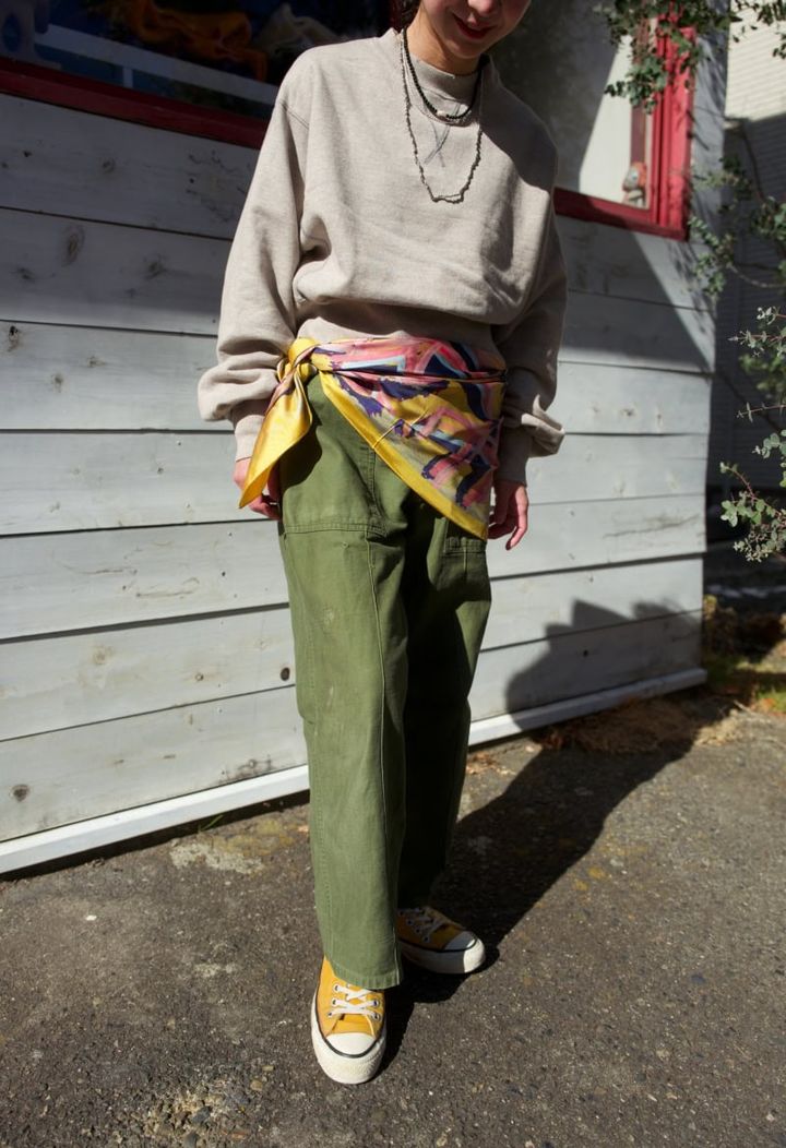 「PURのスウェットトップスは、毎年定番人気のアイテムです。私は、やわらかい表情のライトグレーをチョイス。ボトムはヴィンテージのミリタリーパンツで、全体をカジュアルにまとめています。イエローベースの柄スカーフをベルト風にONして、洒落感をアップ。コンバースもイエローを選んでさりげなくリンクさせています」(PURデザイナー・八木下泉さん)