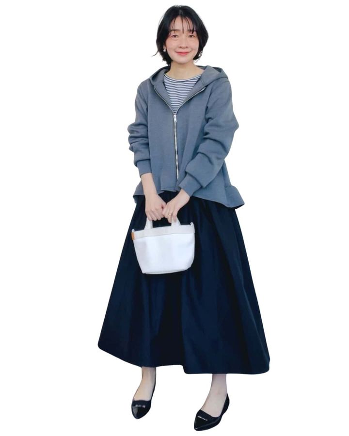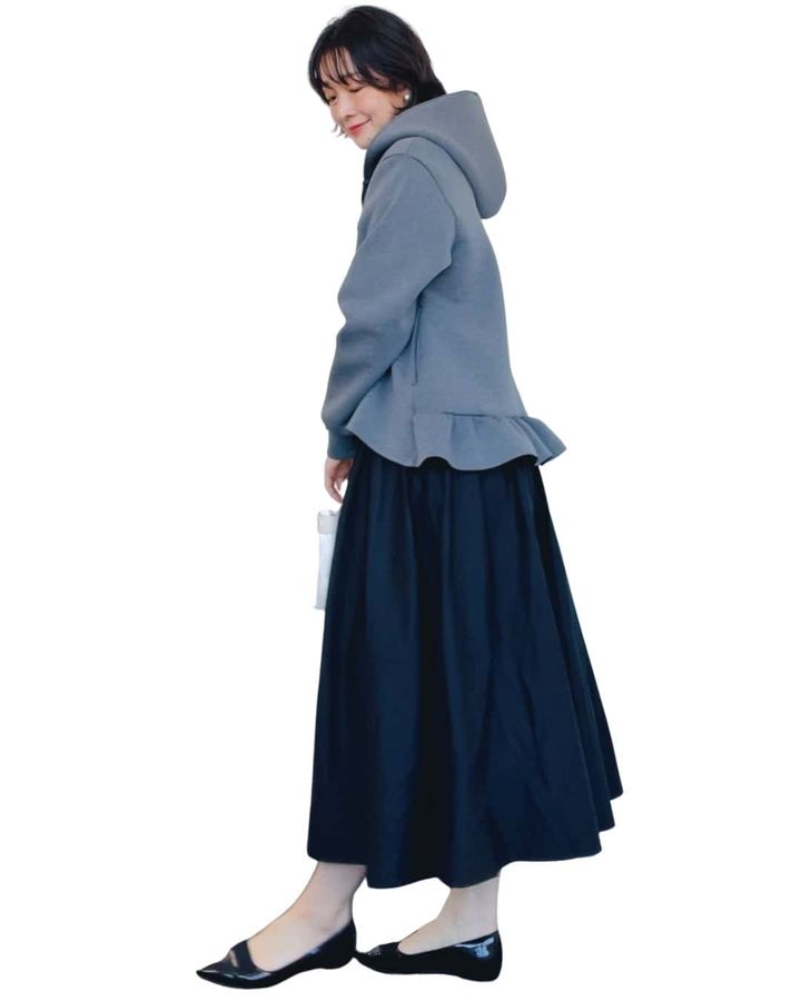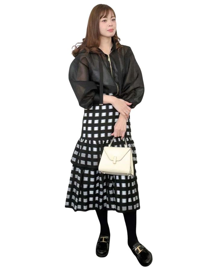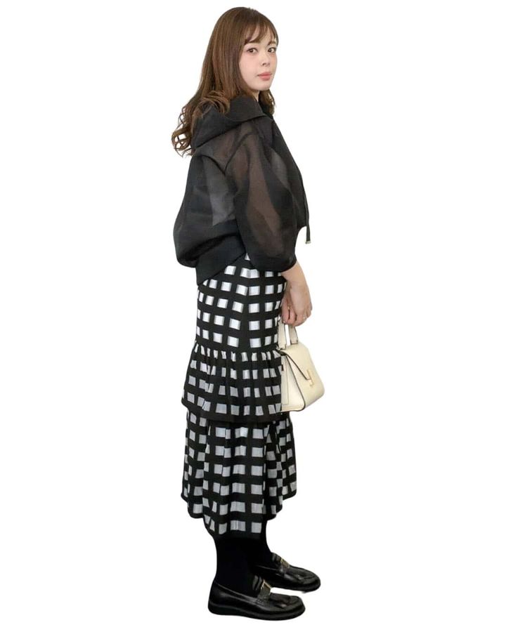 「フリルが広がるシルエットで、気になるお腹やヒップラインをふんわりカバー。ダブルジップでスタイルアップ効果も。」naomiさん(165cm/骨格:ナチュラル)