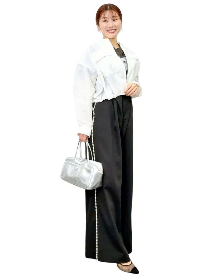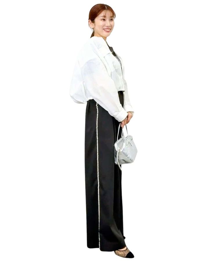 「サイドにあしらわれたパールラインのおかげでスポーティーになりがちなラインパンツが品格のある大人のきれいめパンツに。」田代かな子さん(157cm/骨格:ナチュラル)