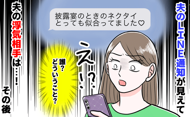 夫が寝落ちした隙にスマホを手に取ると、通知画面には、見覚えのある名前の女性から「あの披露宴のときのネクタイ、似合っていましたよ」という意味深なメッセージが届いていました。