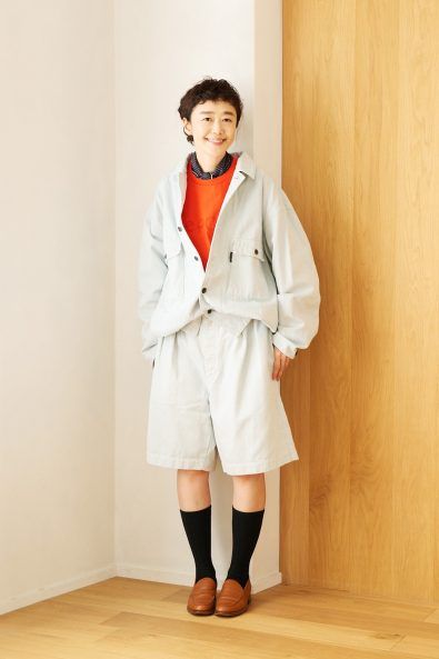 中に着たトップスは、滝口さんが企画に携わった人気のnest Robe「epoch」シリーズの一枚。ボディと同色で胸もとに施されたロゴ刺しゅうがさりげない表情を添えています。
