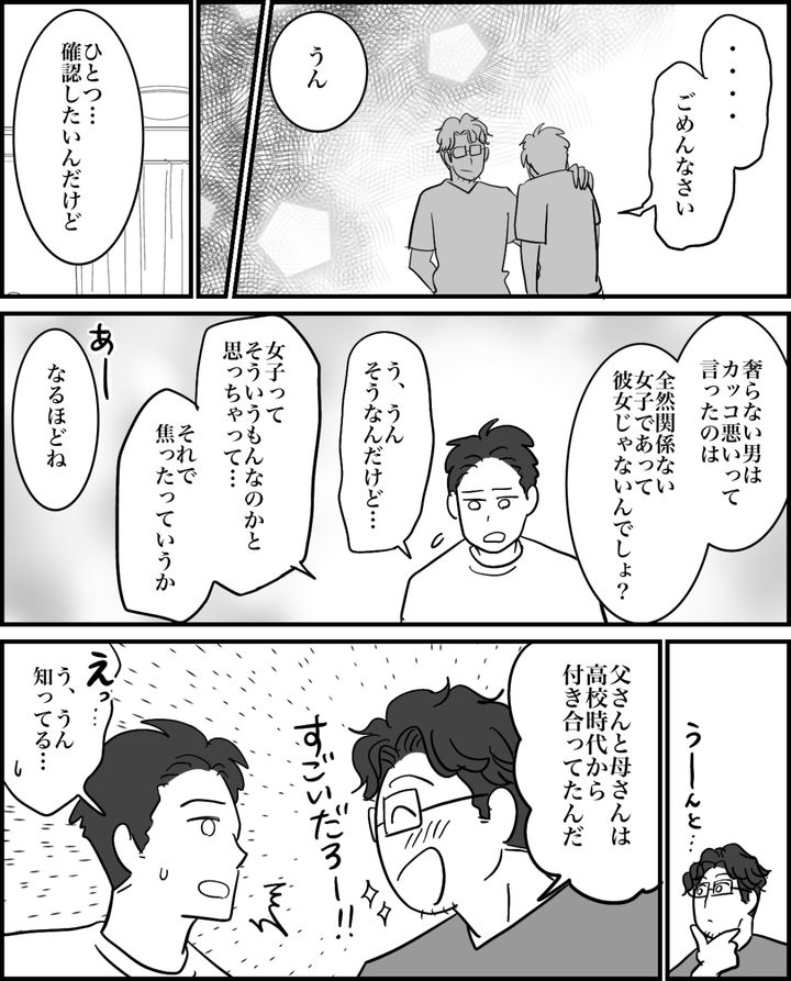 俺は高1のハルマ。付き合いはじめたばかりのサラと、彼女の誕生日にテーマパークでデートすることになりました。俺は知らない女子たちの「デートは男が全部奢るべき」という会話を真に受け、自分が全額出してあげると決めたのです。親に頼めばいいと安易に考え、母さんに「いいから早く3万円出せよ」と迫った俺。しかし父さんから「泥棒が他人の金を奪って、誰かに奢るのはカッコいいことなのか?」と諭され、自分の間違いに恥ずかしくなりました。