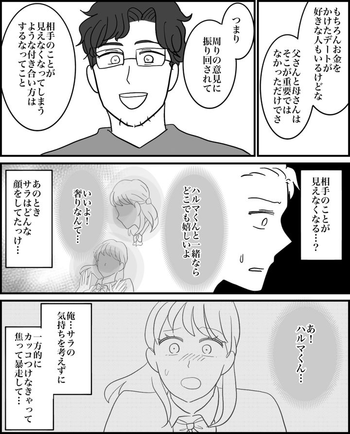 「別に奢るのが悪いことだとか、どちらが正しいとか間違っているとかじゃない。まわりの意見にいちいち振り回されないで、ハルマとサラちゃんが納得できるような付き合い方を考えるべきなんだ。それがいちばん大切なことなんだよ」