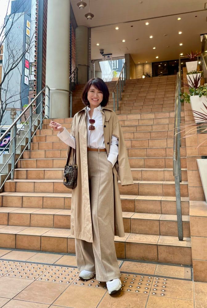 「白シャツが大好きで、この春は白シャツ×ベージュ系でまとめるのが気分です♪『マックスマーラ』のシャツは、さりげないパイピングデザインがお気に入り。『essenロートレアモン』のトレンチコートはロング丈ですが、袖部分からざっくりとシャツを覗かせられるデザインで重たくなりません」