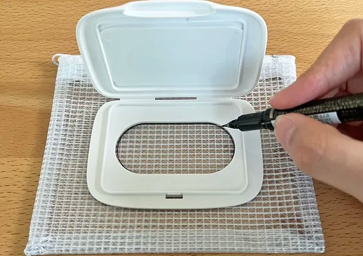 ケースの中央にウエットシートの蓋を置き、取り出し口に合わせて印をつけます。