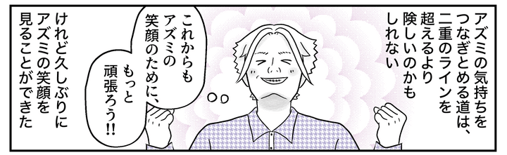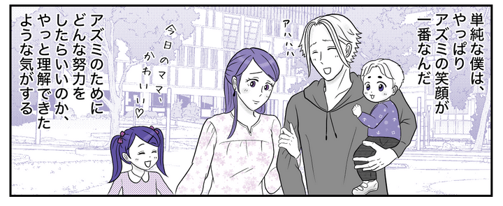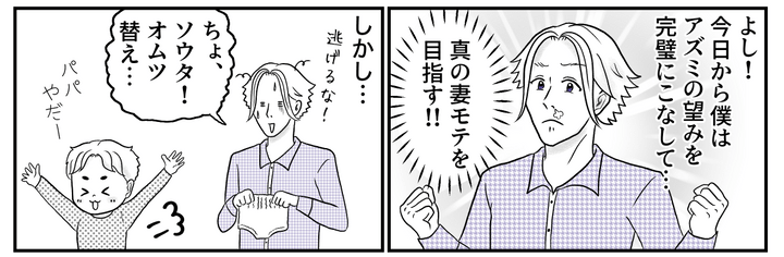 翌朝から必死に家事育児に挑んだものの、現実はオムツ替えひとつで手一杯……。けれどカッコ悪い僕の姿を見て、なぜだかアズミは微笑んでくれた。どうやら僕は努力の方向を間違えていたようだ。これからは自分のカッコよさを見せつけるより、アズミが望むことを一緒に頑張る夫になりたいと思う。