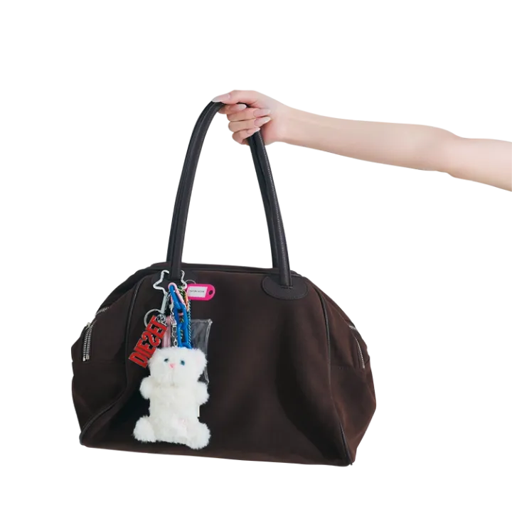 スエードボストンバッグ(22×42×22㎝)24,860円/CHRISTINE PROJECT、ネコキーリング 4,510円/mucu and ebony(ともにHANA KOREA) ロゴキーリング 14,300円/ディーゼル(DIESEL JAPAN) チャーム(ネコつき)4,950円/マミタス(ビームス)