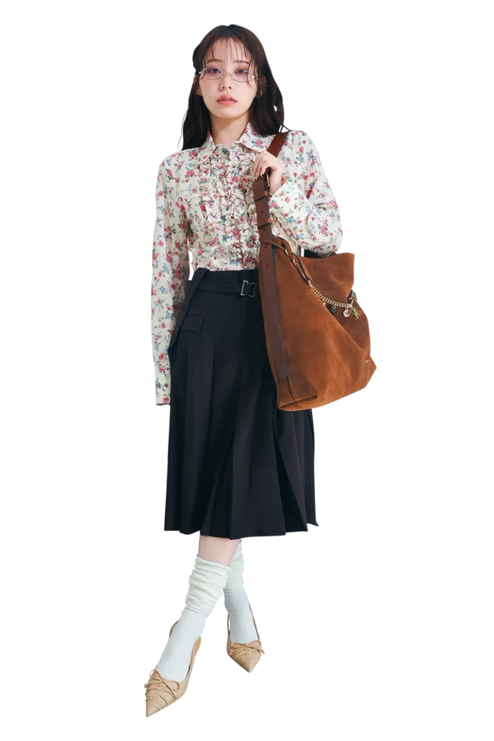 ブラウンスエードバッグ(36×47×10.5cm)110,000円、チャームチェーンストラップ 33,000円/ともにコーチ(コーチ・カスタマーサービス・ジャパン)フリルつきシャツ 5,990円、プリーツスカート 9,990円/ともにZARA(ザラ)メガネ 4,400円/NADIA FLORES EN EL CORAZON ソックス 1,099円/GRL パンプス 9,900円/チャールズ&キース(チャールズ&キース ジャパン)