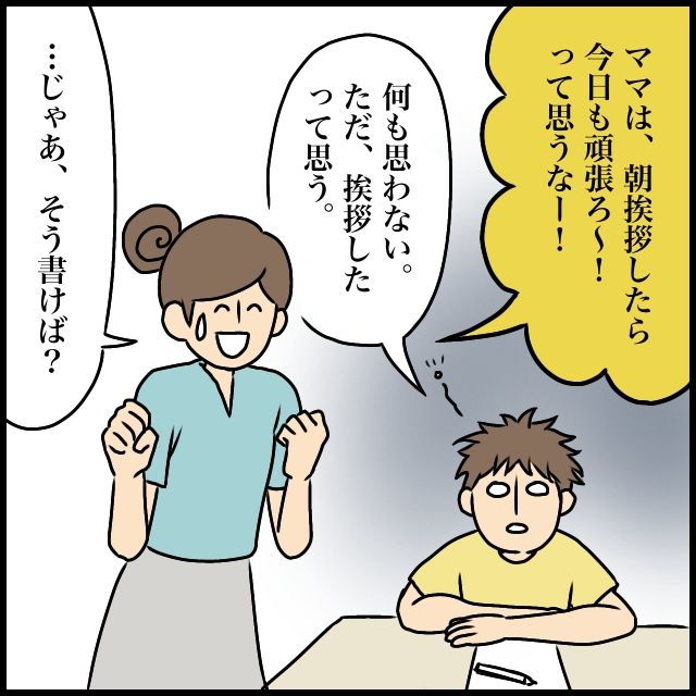 息子のやる気を削がないよう「ママは、朝挨拶したら今日も頑張ろ~!って思うなー!」と明るく答えつつヒントを与えるも・・「何も思わない。ただ、挨拶したって思う」とやる気ゼロの息子。私は呆れて「・・じゃあ、そう書けば?」と言うと、