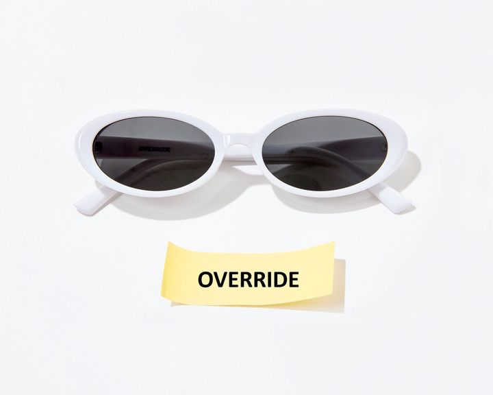 ホワイトのフレーム×ブラックのレンズでノームコアなムードを満喫。プラスするだけで、エッジのきいたコーディネイトに。¥4,290/オーバーライド(オーバーライド 神宮前店)