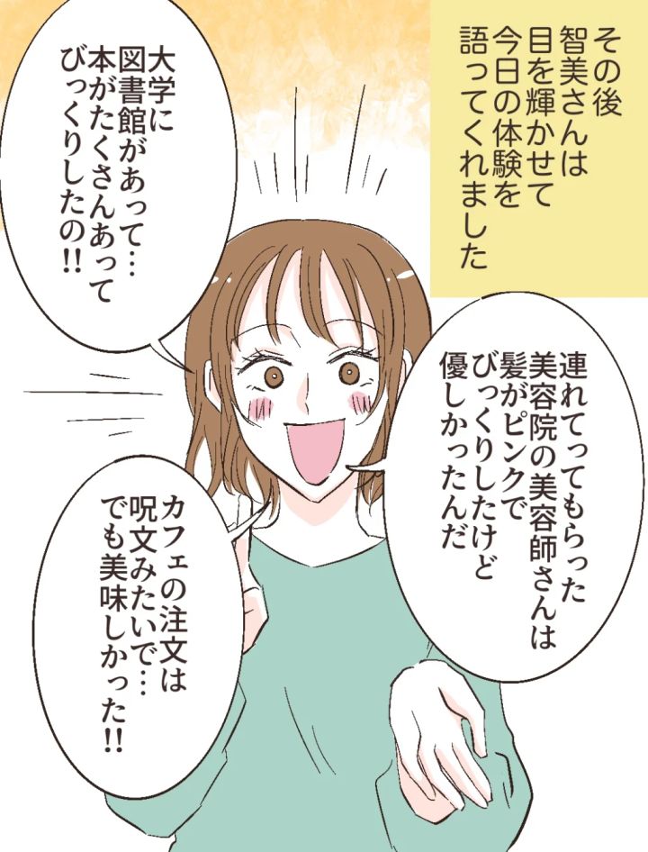 その後、智美さんは目を輝かせながら、今日1日の体験を楽しそうに話してくれました。図書館に本が溢れていて驚いたこと。美容師さんの髪がピンク色だったけど、とても優しかったこと。カフェの注文が呪文みたいで戸惑ったこと。私たちにとっては何気ない日常でも、智美さんにとってはすべてが初めての体験でした。