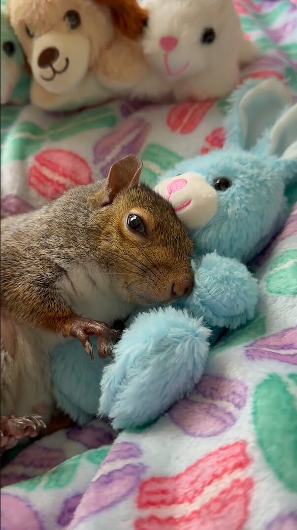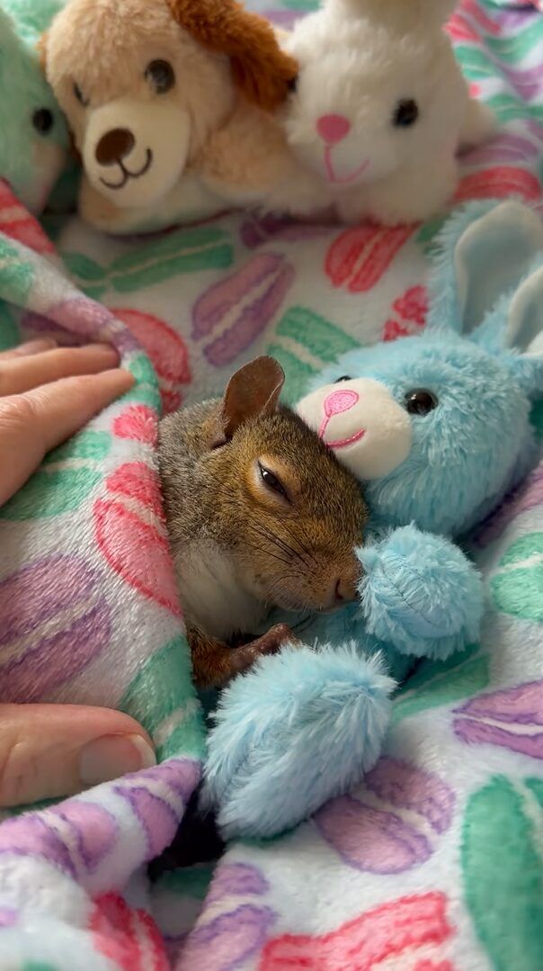 ウサギのぬいぐるみをだっこするリス。ナデナデしてもらっているうちにウトウトしてきて・・おやすみなさい【アメリカ・動画】