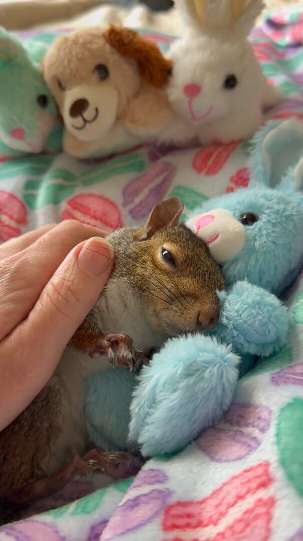 だっこが大好きだというリス。 お気に入りのぬいぐるみに抱きついたまま飼い主さんにナデナデしてもらっているうちに、この子は目がとろ~んとしてきていました。