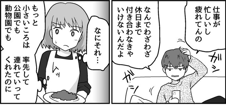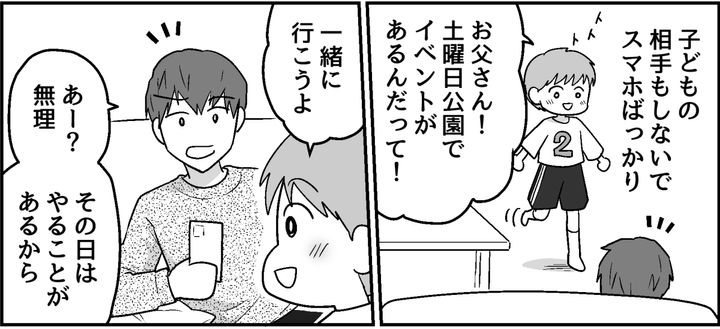 ケントが話しかけても、タカノリはスマホから目を離しません。そして明らかに疎ましそうな声でイベントの誘いを断ったのです。子どもたちが小さいころは積極的に面倒を見て、休日のお出かけにもよく連れていってくれたのに……。
