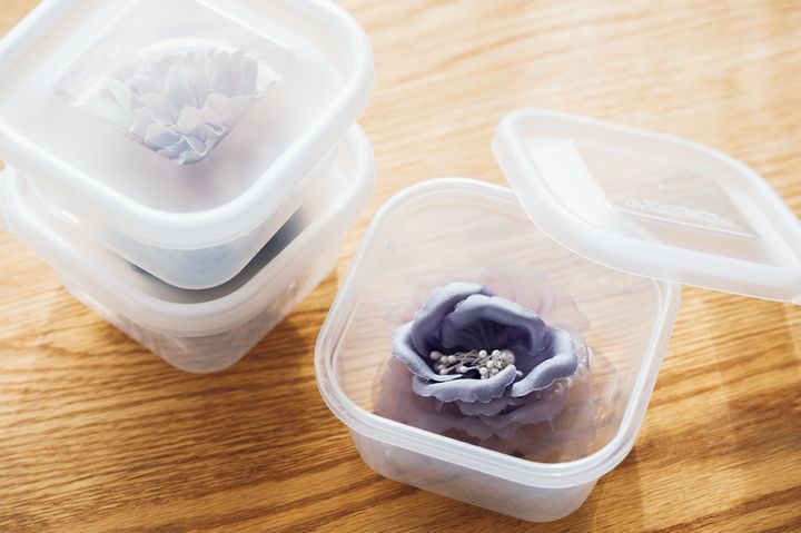 形くずれを防ぐためにはコサージュをつぶさないように保管しなければいけません。そこで役立つのがプラスチック製の食品用保存容器。強度が高いのでつぶれないうえ、積み重ねもできます。