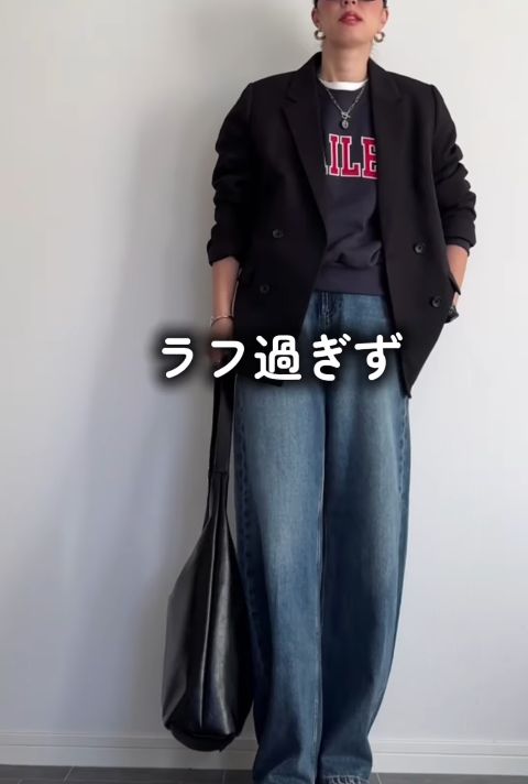 GUの「ダブルブレストジャケット」4,990円(166cmでサイズXL着用)を主役にした、mhi_7746さんの端正なデニムスタイル。カッチリとした印象のブラックジャケットに、あえてラフなロゴスウェットとワイドデニムを合わせることで、こなれた日常着へと昇華させています。このジャケットは程よいゆとりがあるため、厚手のインナーを仕込んでも着膨れせず、袖をたくし上げて手首を見せることで軽やかな抜け感も演出可能。