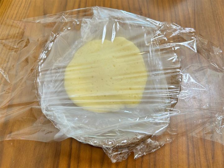 3. 加熱が終わったら、上のラップを剥がして新しいラップをかけ直す。下のラップごと持ち上げてひっくり返して、上になったラップを剥がして丸める。丸めたラップを生地の中心に置く。