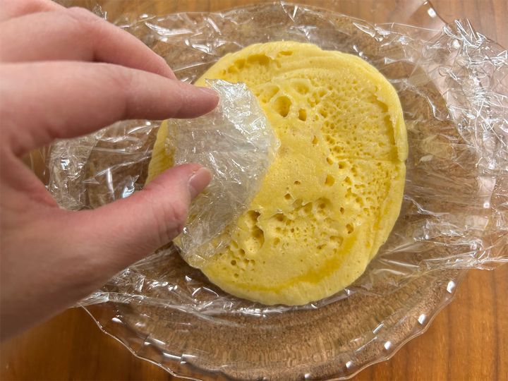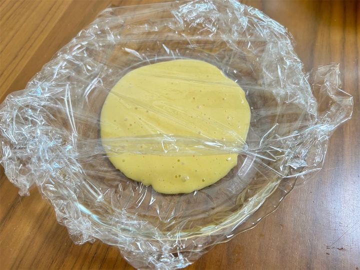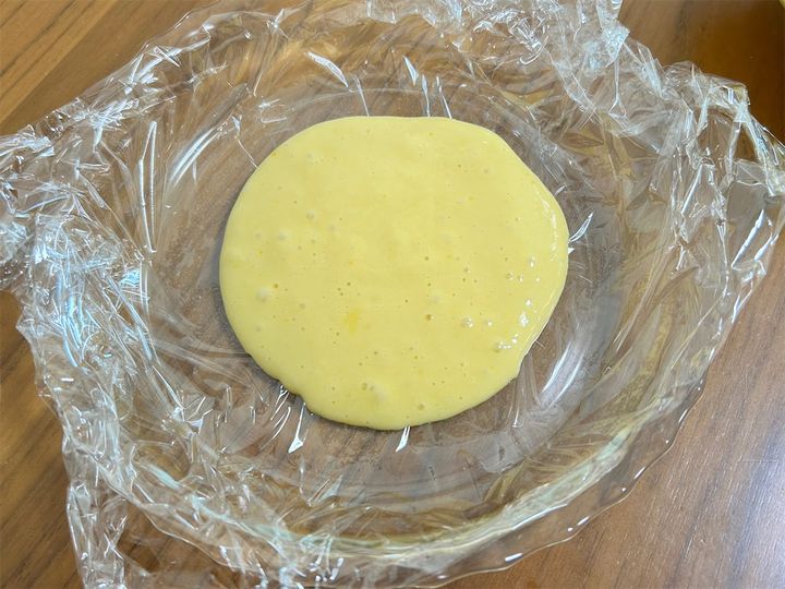 2. 高さのある平らな耐熱容器(高さ2~3cm以上のもの)にラップを敷き詰め、1をお玉1杯分落とす。生地の上にラップをかけて1か所蒸気口を作り、600Wの電子レンジで1分30秒加熱する。