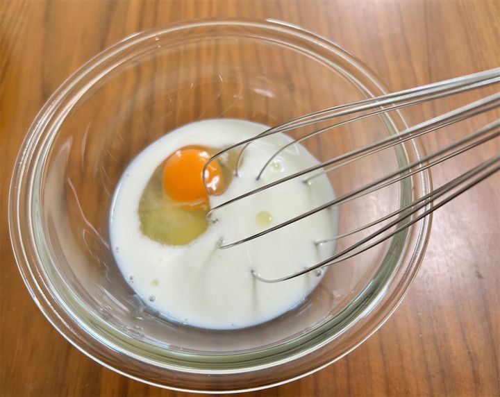 1. ボウルに[A]を入れて泡立て器で混ぜたら、ホットケーキミックスを加えて滑らかになるまで混ぜる。