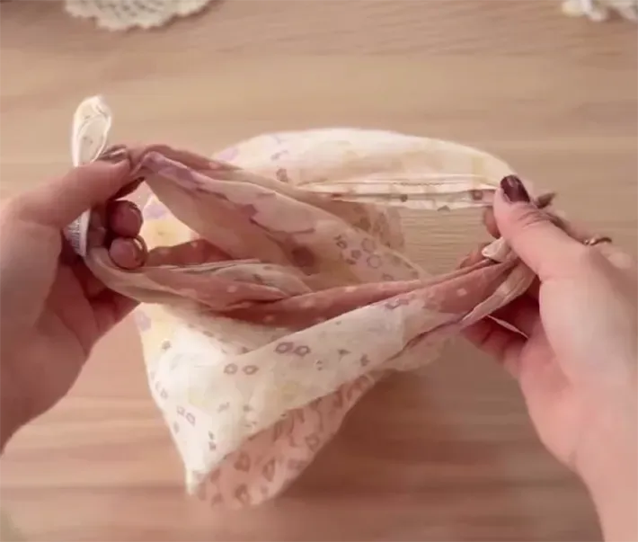 ハンカチを広げて、向かい合っている角を手に取り、2回結びます。