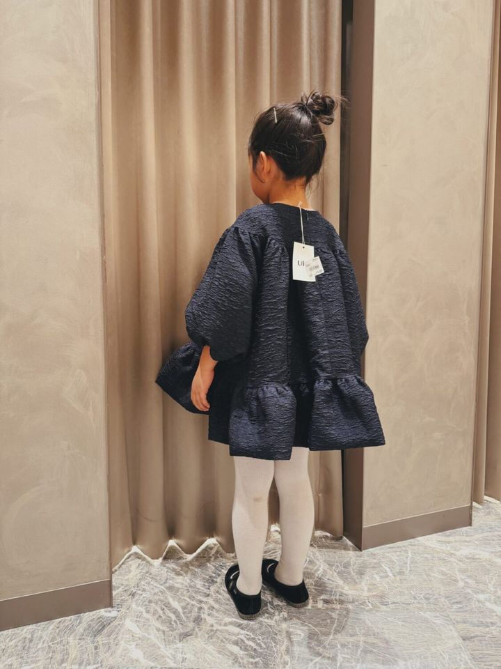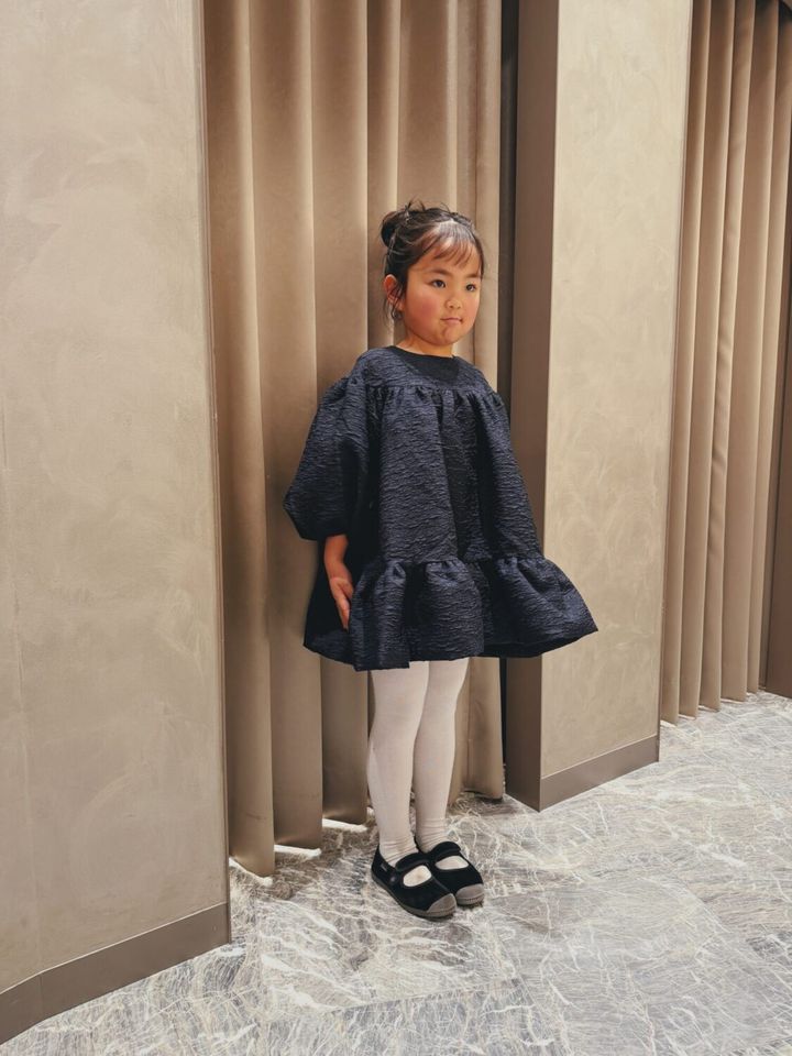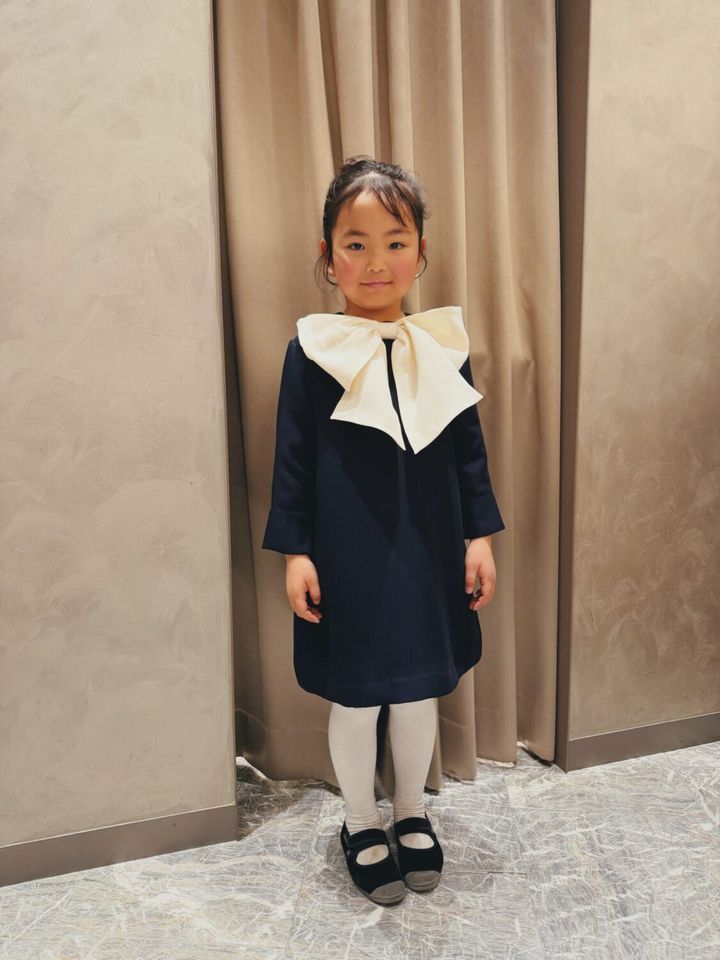ワンピース / Christina Rohde靴下 / MP Denmarkシューズ / H&Mニットつけ襟 / 私の母作六本木ヒルズのキャトルサンクで購入したデンマーク発のクリスティーナローデのワンピースに、MP Denmarkのラメソックスを合わせました。ワンピースのサイズが大きかったので首元が少し寂しく、母にニットのつけ襟を作ってもらいました。このワンピースは5歳まで3年間着ることができました。靴下は、サイズアウトしてもなお履きたがるほどのお気に入りです。お値段はお高めなのですが、買ってよかったもののひとつ。何度か違うカラーもリピートしています。一足あると便利で、長く使えます!ギフトにもおすすめ!そして、シューズは歩きやすいのがいいかなと思い、普段から愛用していたH&Mのバレエシューズにしました。髪の毛は乱れやすいので少しオイルをつけて二つに結び、小さなお団子にしました。毛量がない子にもおすすめです。
