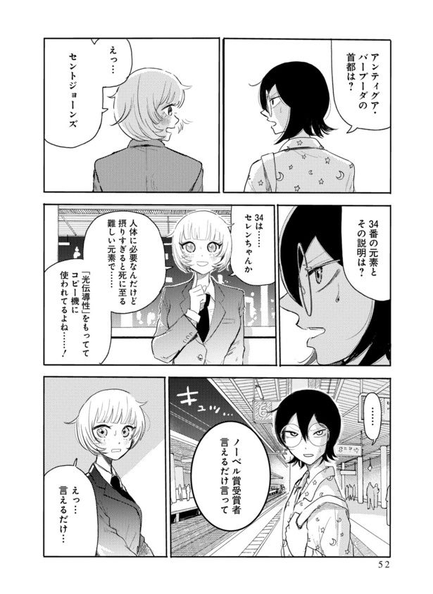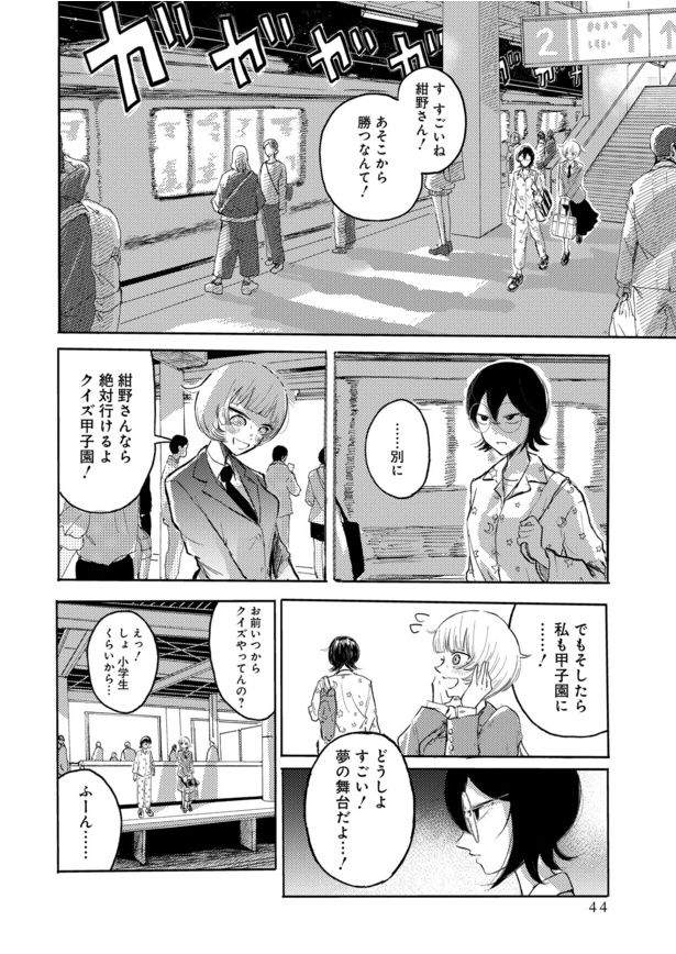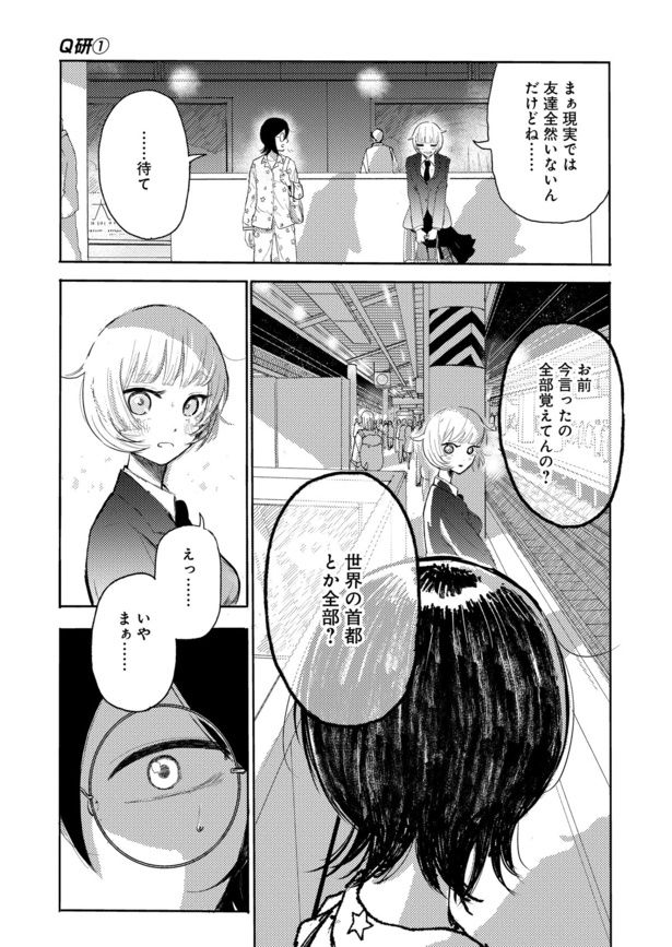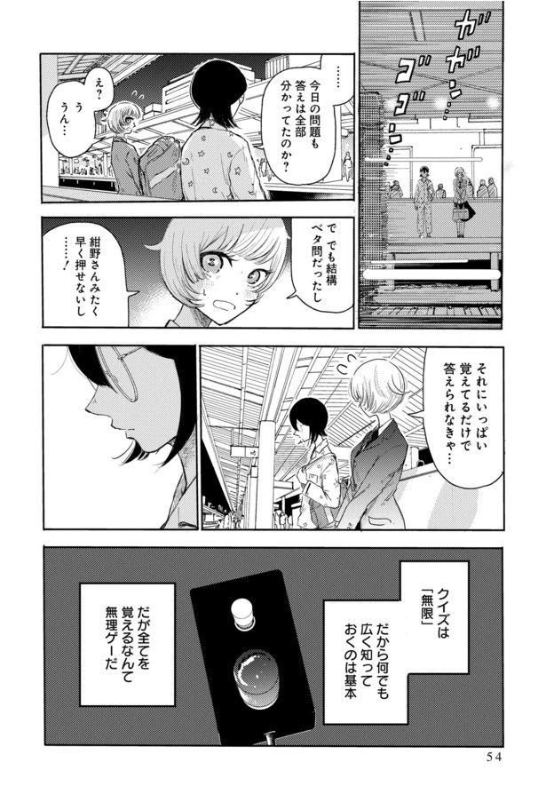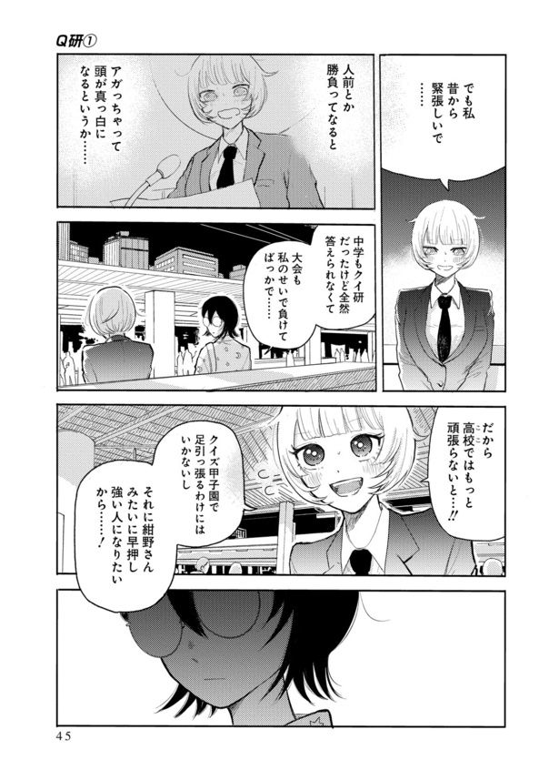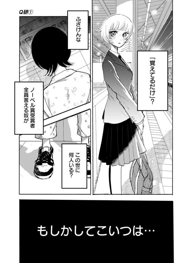 些細なことでも緊張して頭が真っ白になってしまう性格のせいで、何をやっても上手くいかない三影雪。好きだったクイズも中学時代に周りに迷惑をかけたことで孤立し、辞めてしまっていた。そんな雪が高校入学後に出会ったのは「クイズ甲子園出場」を公言する同級生・紺野一花。雪が持つ圧倒的な記憶容量に気が付いた彼女の言葉に触発されるように「一緒にクイズ甲子園優勝しよう」と宣言し…!? 競技クイズに魅了された2人の女子高生の記憶と情熱が重なり合う熱き青春群像劇『Q研』をお楽しみください!