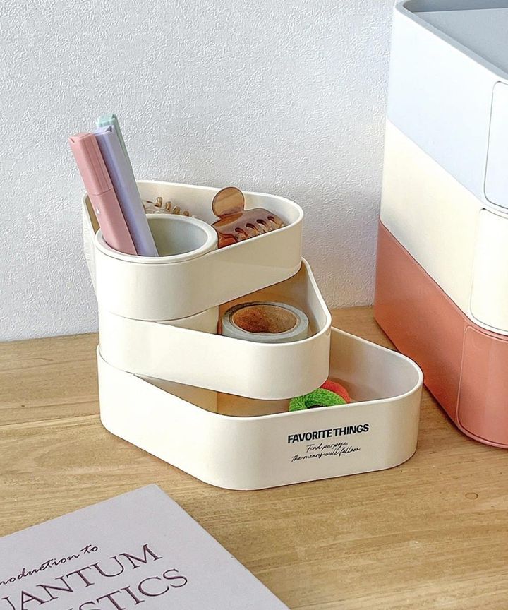 ペン立てと小物トレーが一体になった、デスク整理に便利なアイテムです。ペンを立てて収納できるスペースに加えて、クリップや付箋などを入れられる3段トレー付き。トレーは可動式なので、小さな文房具を分けて収納でき、デスクの上をすっきり整えられます。