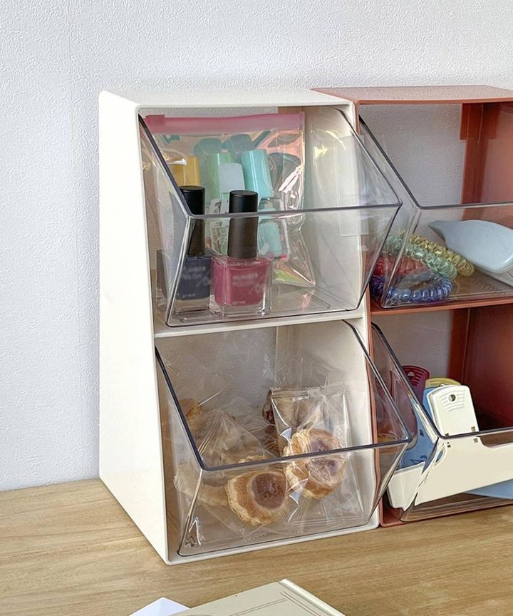 2段構造で小物を整理できる収納ケース。隣り合うケースを連結パーツで固定でき、並べて使っても安定します。 文房具やデスク小物の整理はもちろん、お菓子やティーバッグなどのストッカーとして使うことも可能です。