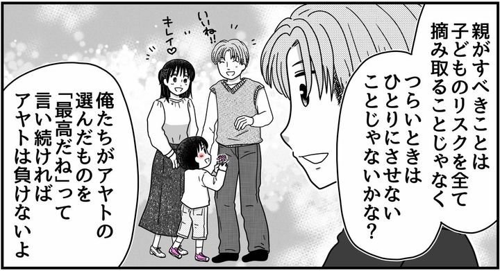「アヤトは自分の感性に自信を持ってるんだよ。それを世間体が悪いからっていう理由で取り上げちゃったら、アヤトの感性は死んじゃうよ。もしまわりから何か言われたら、そのときに一緒に考えよう。親がすべきことは、子どもに起こり得るリスクをすべて摘み取ることじゃないよ」というキョウヤの言葉に私はハッとしました。